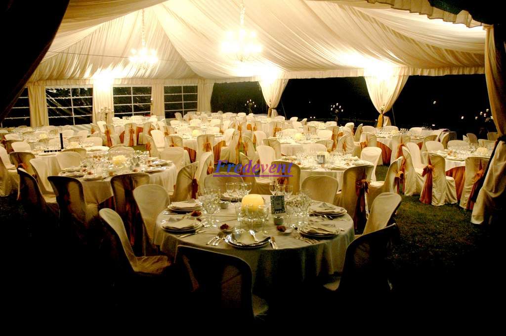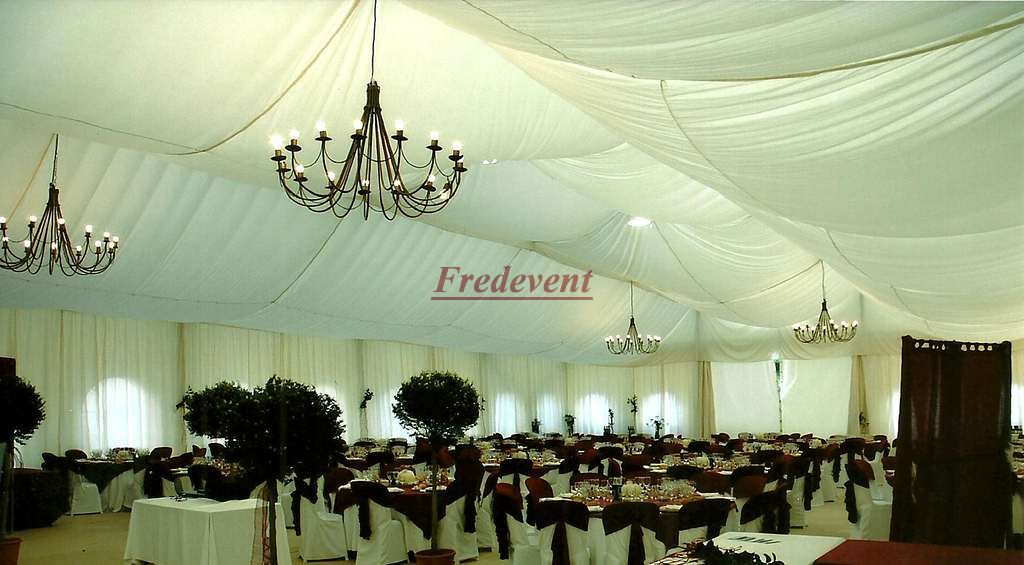 Para su boda disponemos de carpas a 2 aguas, a 4 aguas o bien pabellones poligonales para bodas muy numerosas, de diversas alturas y de gran variedad de medidas de pórticos. De lonas opacas o transparentes, distintos tipos de suelo, de iluminación, de enmoquetados. Decoramos las carpas en el interior con telas con distintos tipos de plisado, etc.